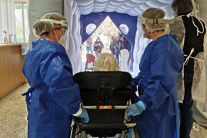 Sperando che vaccini, precauzioni e profilassi consentano di stoppare a breve la diffusione del virus e la fine del pericolo pandemico che tanto influisce sulle interazioni sociali, Villa dei Giunchi ha deciso di investire, di contattare l’azienda del nord Italia che ne detiene il brevetto e di acquistare due case degli abbracci, tante quante le due strutture gestite attualmente sotto il marchio Senior People Care, una a Florinas e l’altra in Abruzzo. Da giovedì a Florinas ci si potrà nuovamente stringere in un confortante, rasserenante e sanissimo abbraccio. Diretto ma a prova di Covid, perché la stanza gonfiabile è stata piazzata in uno degli ingressi della casa di riposo, così che i familiari possano accedere dall’esterno e gli anziani non debbano uscire dalla struttura, che è riscaldata e sarà igienizzata dopo ogni utilizzo.