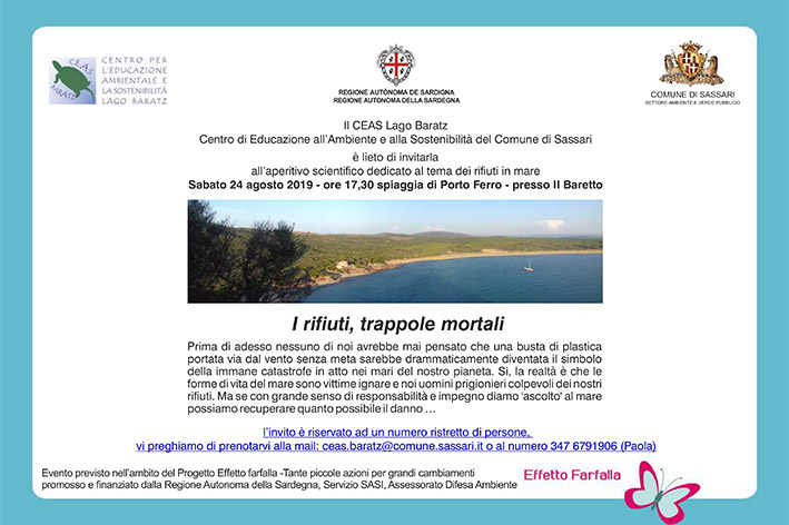 Sassari. Dopo le attività nella spiaggia di Porto Ferro, sabato 24 agosto è in programma un nuovo appuntamento del Ceas Lago Baratz del Comune di Sassari nell’ambito progetto regionale Effetto Farfalla. Nel Baretto di Porto Ferro, alle 17,30, si parlerà di rifiuti in mare e del grave danno che questi stanno causando all’ecosistema marino. L’incontro “I rifiuti, trappole mortali” sarà condotto dalla naturalista Lara Bassu. Sarà l’occasione per presentare alcuni dati significativi su questo grave fenomeno e la cruda realtà delle conseguenze sulle forme di vita. La discussione sarà aperta al contributo di tutti mentre saranno presentate le indispensabili azioni da intraprendere, sia come singoli sia come comunità, per contribuire ad arrestare il danno e le inevitabili conseguenze sulla vita dell’intero pianeta.