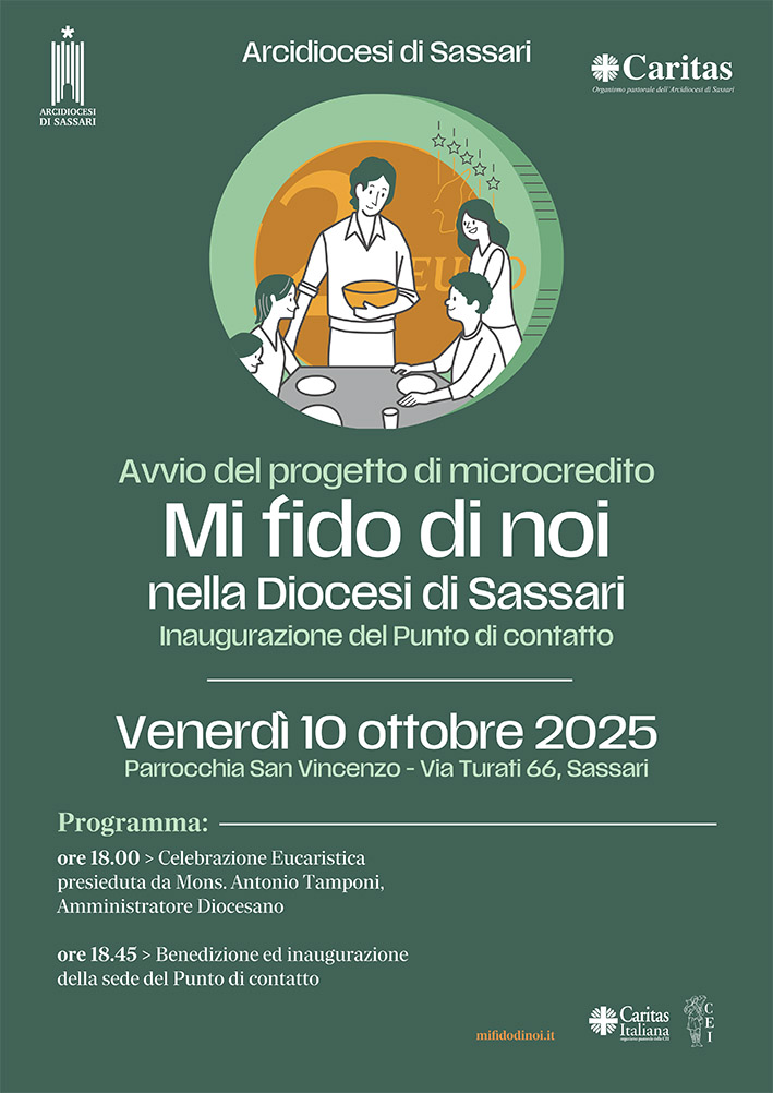 Venerdì prossimo 10 ottobre sarà inaugurato a Sassari “Mi fido di noi”, il progetto nazionale di microcredito sociale promosso dalla Conferenza Episcopale Italiana (CEI) e da Caritas Italiana, realizzato in collaborazione con la Diocesi di Sassari in occasione del giubileo 2025. Il programma prevede alle 18 la celebrazione nella parrocchia di San Vincenzo (via Turati, 66 Sassari) e al termine della Santa Messa, intorno alle 18,45, si terrà la benedizione e l’inaugurazione dei locali nello stesso luogo alla presenza dell’amministratore diocesano, monsignor Antonio Tamponi.
