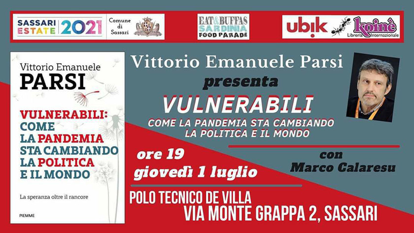 Sassari. Giovedì 1 luglio alle 19 al Polo Tecnico di via Monte Grappa la rassegna letteraria inserita nel programma di SassariEstate 2021 ospita Vittorio Emanuele Parsi per la presentazione del suo libro “I vulnerabili. Come la pandemia sta cambiando la politica e il mondo”. Dialoga con l’autore Marco Calaresu. L’incontro è organizzato dalla libreria Koinè-Ubik e dall’associazione Eat&Buffas.