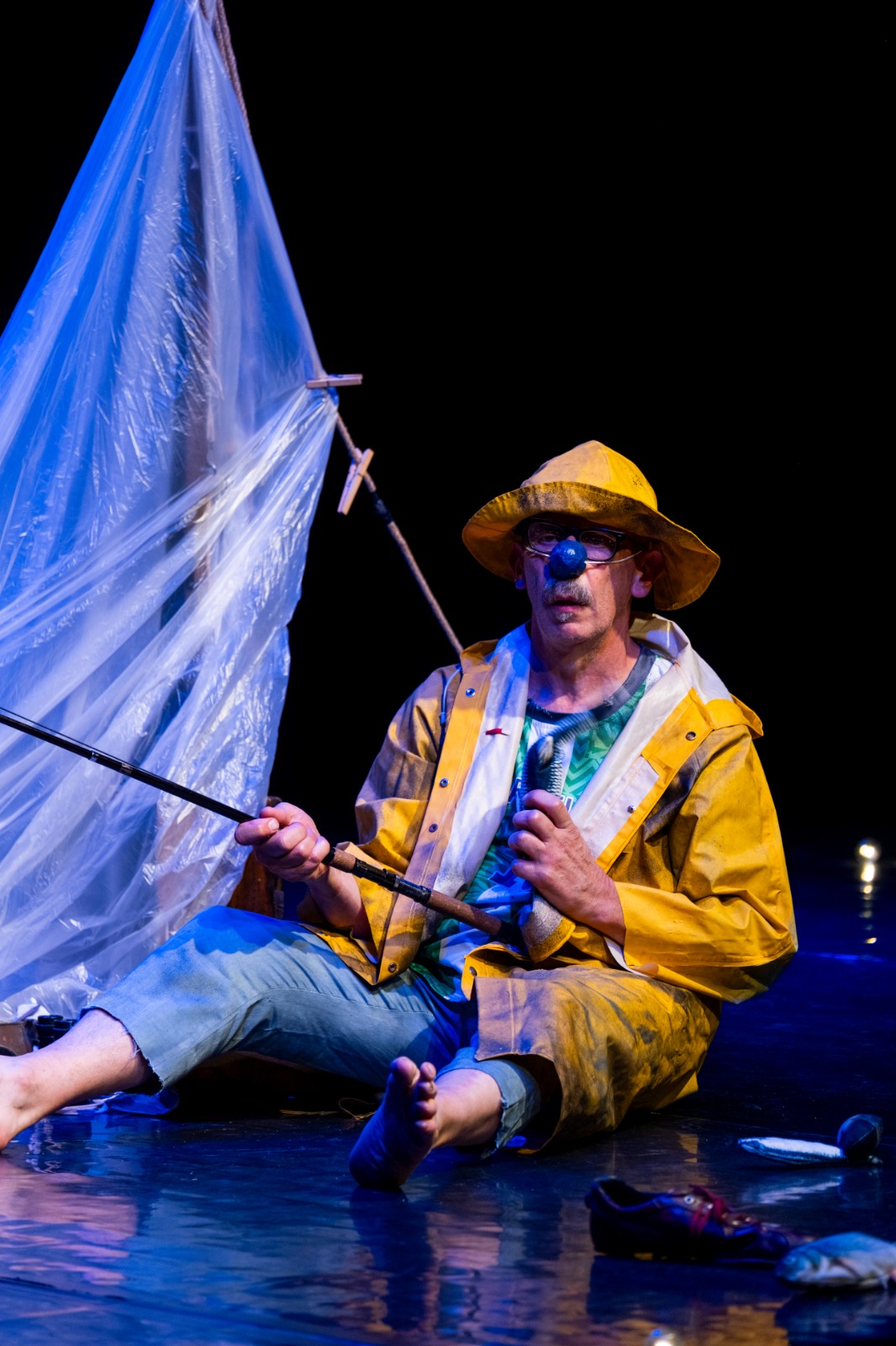 Un vecchio marlin e un vecchio pescatore si incontrano al largo dell’oceano. Non si conoscevano prima, non si erano mai incontrati prima. Si studiano, cercano di capire cosa pensa l’uno e cosa ragiona l’altro, finché per far bella figura davanti al pubblico, decidono di darsi battaglia con un gran sciabordio d’acqua e sussulti d’onda. Un po’ la metafora di ciò che gli artisti fanno quando si illudono pensando di riuscire a rendere il mondo un luogo migliore, senza riuscirci. Ma non si può fare a meno di continuare. Questa è anche la storia di un piccolo uomo che mette in gioco la sua vita per catturare un grande pesce, ma quell’uomo è anche un piccolo e vecchio clown pieno di dignità e grazia che gli uomini giusti vedono guardandosi allo specchio.