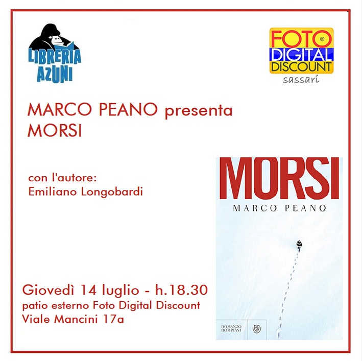 Sassari. Giovedì prossimo 14 luglio alle 18,30 Marco Peano presenta il suo nuovo romanzo “Morsi” (Bompiani). Un evento promosso dalla Libreria Azuni nel patio esterno di Foto Digital Discount in viale Mancini 17A. Con l’autore interverrà Emiliano Longobardi.