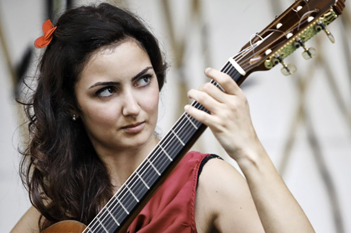 Altro classico che arricchisce spesso i programmi per chitarra sola è la musica di Mauro Giuliani (1781-1829) uno dei punti di riferimento della scuola chitarristica italiana di tutti i tempi e spesso definito il “Paganini della chitarra” per la sua scrittura elegante e virtuosistica che si potrà apprezzare pienamente nell’esecuzione della “Grande Ouverture, op. 61”. Il programma prevede anche Homenaje pour le Tombeau de Debussy che Manuel De Falla scrisse nel 1918, due anni dopo la morte del grande compositore francese di cui era amico. Si tratta di un brano ricco di suggestioni derivate dallo stile “cante jondo” che lo stesso Debussy aveva interpretato nelle sue “Soirèe dans Grenade” evocando l’atmosfera calda e luminosa della siesta a Granada. Così è il ritmo di Hanbanera a fare da scansione nel ricordo amicale di questa elegia funebre che risulta così al contempo struggente e viva.Compiendo un salto di trecento anni verso il passato, la chitarra di Maria Luciani si cimenterà con le sonorità sicentesche vergate nel 1596 dal celebre compositore inglese Johnn Dowland, con la “Earl of Essex Galliard” raffinato esempio di trattemento di temi popolari intrecciati tra loro e arricchitti di variazioni, scritto in omaggio alla figura del travagliato conte di Essex Roberto Devereux, condannato a morte per tradimento nel 1601 la cui vicenda ha ispirato poi nell’800 anche famose pagine del melodramma.