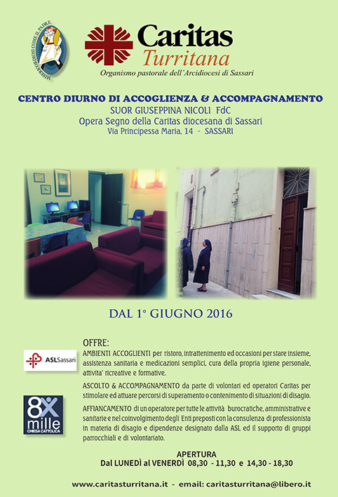 Sassari. Verrà inaugurato mercoledì 1 giugno alle 17,30 il nuovo Centro di accoglienza diurno della Caritas di Sassari. Saranno presenti l’arcivescovo padre Paolo Atzei, il direttore della Caritas Italiana monsignor Francesco Soddu, la madre visitatrice delle suore Figlie della Carità suor Rina Bua, i responsabili della Asl di Sassari partner del progetto, le autorità civili. Nella casa di via Principessa Maria 14 il nuovo Centro, intitolato a suor Giuseppina Nicoli FdC, offrirà ambienti accoglienti per ristoro, intrattenimento e occasioni per stare insieme, assistenza sanitaria e medicazioni semplici, cura della propria igiene personale, attività ricreative e formative. Dall’osservazione dello stato di bisogno del territorio e dalla valutazione delle risorse umane, economiche e strutturali a disposizione è nato il progetto di accompagnamento diurno, cofinanziato dalla Caritas Italiana con i fondi dell’8×1000 che, collegato a tutte le Opere Segno presenti in diocesi, ed in particolare all’Ostello, ha lo scopo di dare una casa a chi è “sbandato” e non ha luogo di riferimento.