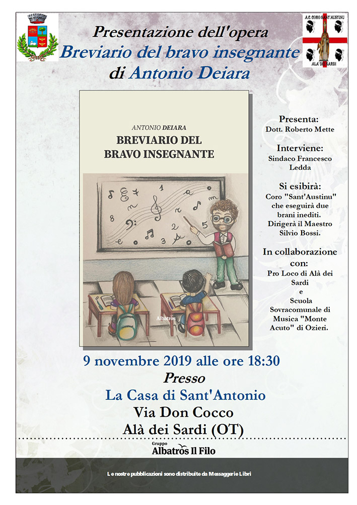 Si parte con le “Cinque Regole d’oro”, poste alla base del complesso rapporto insegnante-alunno, per poi proseguire definendo percorsi educativo-didattici innovativi. Colpisce il lettore la nuova Funzione-docente facoltativa, con 36 ore settimanali “all inclusive” (orari di cattedra invariati, ferie uguali a quelle degli altri lavoratori e stipendi europei); appassiona i ragazzi la proposta di uno stipendio per gli studenti che studiano e piace ai genitori il principio della gratuità de “L’obbligo dei libri e il libri per l’Obbligo”. Il ruolo del personale ATA assume una nuova importanza educativa, oltre il principio dell’essere “VI.P” (Vigilanza e Pulizia), mentre non c’è scampo per i pelandroni, da licenziare grazie agli Ispettori scolastici senza se e senza ma. Una serie di scritti è dedicata alle problematiche del comportamento, un’altra al ruolo dei genitori che dovrebbero conseguire un’apposita patente. Non potevano mancare i riferimenti alle problematiche della “Scuola sarda Europea”, dalla tutela a favore delle minoranze linguistiche catalana e sarda all’Istituzione obbligatoria per l’Amministrazione dei nuovi Indirizzi Musicali (culminata con la vittoria della Flc-Cgil di Sassari davanti al Tar per la Sardegna del 3 ottobre scorso). Ricca di curiosità la sezione “Fabula docet” che, con tratto lieve e ironico, mette in luce questioni vitali per un’istruzione di qualità per tutti: numero di alunni per classe, musica in tutti i gradi d’Istruzione (quanto meno a partire dalla prima elementare), il mancato rispetto della parola data dai politici di turno, etc. Altri scritti catturano il lettore, dall’inutilità della sesta ora all’assurdità della formazione dei docenti affidata a formatori che non hanno mai varcato la porta di un’aula scolastica, dallo spreco del concorso a cattedre stile “Lascia o raddoppia” alla necessità “risparmiosa” di promuovere il concorso per titoli per chi ha superato una selezione draconiana sancita da meno del 10 per cento di idonei. Chiude l’opera il carteggio con l’allora premier Matteo Renzi e il ministro-giardiniera Valeria Fedeli, senza dimenticare il bilancio finale impregnato di ottimismo sulla declinazione per quattro decenni di “profepassione”. La presentazione del “Breviario del bravo insegnante” avrà luogo ad Alà dei Sardi, sede della messa in scena, in forma di oratorio, della prima opera in lingua sarda e nelle varietà alloglotte, “Paràulas e Sonos de Sardigna” del M° Gian Battista Ledda, sabato 9 novembre alle ore 18,30, presso la Casa di Sant’Antonio. L’organizzazione è affidata al pluripremiato Coro “Sant’Austinu”, in collaborazione con l’Amministrazione comunale guidata dal sindaco Francesco Ledda, la Pro Loco e la Scuola sovracomunale di Musica “Monte Acuto” di Ozieri diretta dal maestro Ugo Spanu. Presenterà il dottor Roberto Mette, che interloquirà con l’Autore, ed interverrà il “Sant’Austinu” di Alà, istruito e diretto dal maestro Silvio Bossi, con due brani inediti studiati durante il Corso di “Canto Polivocale Sardo” della citata Scuola civica del “Monte Acuto”.