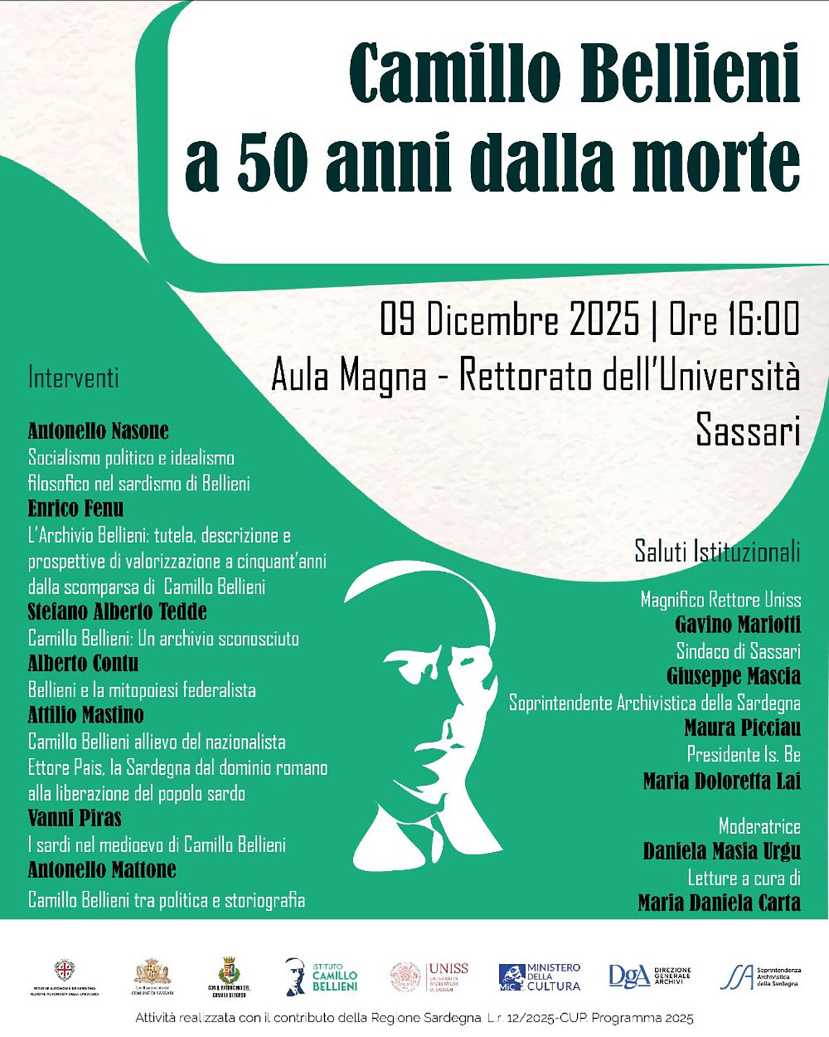 Il dibattito scientifico, moderato da Daniela Masia Urgu, vedrà sul tavolo dei relatori Antonello Nasone (Socialismo politico e idealismo filosofico nel sardismo di Bellieni), Enrico Fenu (L’Archivio Bellieni: tutela, descrizione e prospettive di valorizzazione a cinquant’anni dalla scomparsa), Stefano Alberto Tedde (Camillo Bellieni: un archivio sconosciuto), Alberto Contu (Bellieni e la mitopoiesi federalista), Attilio Mastino (Camillo Bellieni allievo del nazionalista Ettore Pais, la Sardegna dal dominio romano alla liberazione del popolo sardo), Vanni Piras (I sardi nel medioevo di Camillo Bellieni), Antonello Mattone, (Camillo Bellieni tra politica e storiografia). Ad impreziosire e animare il dibattito saranno le letture a tema a cura dell’attrice e scrittrice sassarese Maria Daniela Carta.