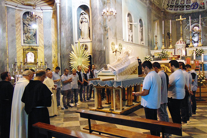 Sassari. È un rito, poco conosciuto, che fa da preludio alla solenne cerimonia di scioglimento del Voto della notte tra il 14 ed il 15 agosto e che segna l’avvio dei preliminari della Faradda. Si tratta dell’Intronizzazione della Vergine Assunta. Il simulacro, già vestito e addobbato nel corso della mattina, ieri pomeriggio, intorno alle 18, è stato portato all’interno della chiesa di Santa Maria di Betlem, dove sosterà di fronte all’altare maggiore la sera di domani. Partita dal chiostro interno del convento, la brevissima processione è stata accompagnata dal canto dei frati minori conventuali e dal tamburo del Gremio dei Muratori. Una volta in chiesa il padre guardiano Alfio Pusceddu, insieme ai confratelli, ha intonato l’Ave Maris Stella.