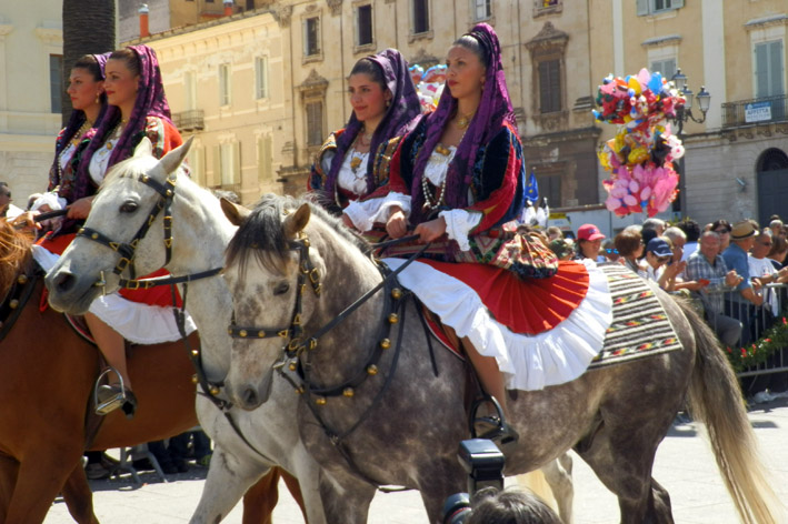 Sassari. La prima Cavalcata Sarda moderna, ed in forma ufficiale, risale al 13 aprile 1899, quando in piazza d’Italia davanti al re Umberto I ed alla regina Margherita sfilarono costumi prevalentemente del nord Sardegna, con 1331 partecipanti. I sovrani italiani arrivarono in città in occasione dell’inaugurazione del monumento realizzato da Giuseppe Sartorio a Vittorio Emanuele ed in loro onore fu organizzato l’evento, su iniziativa del sindaco Gavino Mariotti, che per l’organizzazione si affidò al conte Gerolamo Ledà d’Ittiri. La manifestazione fu ripetuta altre due volte, sempre alla presenza di esponenti di Casa Savoia: nel 1929 arrivò a Sassari Vittorio Emanuele III con la regina Elena e le due figlie Maria e Giovanna, che per l’occasione indossarono due costumi sardi; il 10 giugno 1939 fecero tappa in città invece il figlio Umberto insieme alla moglie Maria Josè. La Cavalcata Sarda stessa affonda le sue radici storiche nelle cavalcate per le vie della città inserite nell’ambito dei festeggiamenti organizzati in onore dei regnanti, come quella del 1711, che, racconta Enrico Costa, fu decisa («far cavalcata») dal Consiglio comunale per celebrare il nuovo re Filippo V di Borbone. Non infine dimenticata la cavalcata spontanea che nel 1796 accolse trionfalmente l’ingresso in città di Giovanni Maria Angioy, capo del movimento antifeudale in Sardegna.