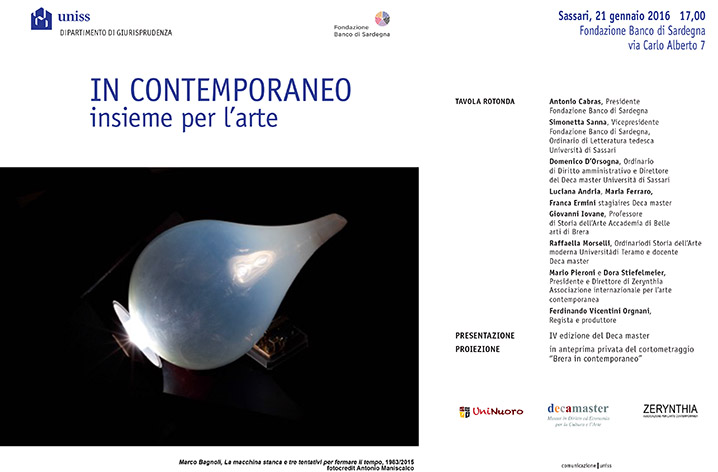 DecamasterSassari. Giovedì 21 gennaio alle 17, nella sede sassarese della Fondazione Banco di Sardegna (via Carlo Alberto 7), si terrà la tavola rotonda “In contemporaneo. Insieme per l’arte”, nell’ambito dei “Pomeriggi della Fondazione”. Sarà l’occasione per presentare la IV edizione del Decamaster – Master interateneo in Diritto ed Economia per la Cultura e l’Arte (Università di Sassari e Cagliari). Inoltre, avrà luogo la proiezione, in anteprima privata, del cortometraggio “Brera in contemporaneo”, alla presenza del regista Ferdinando Vicentini Orgnani.
