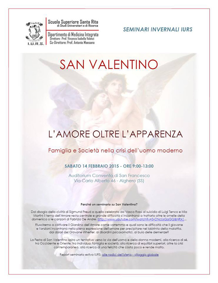 Alghero. L’amore e la passionalità esplorati da diversi punti di vista delle discipline scientifiche e umanistiche che hanno affrontato il tema. In particolare, i disordini esistenziali amorosi che turbano l’animo e la felicità dell’uomo e della donna moderni saranno al centro del Seminario Invernale IURS (Istituto Universitario di Ricerca Scientifica Santa Rita), che si svolgerà ad Alghero il 14 febbraio, presso l’Auditorium del Convento di San Francesco, in occasione del giorno dedicato a San Valentino patrono degli innamorati.