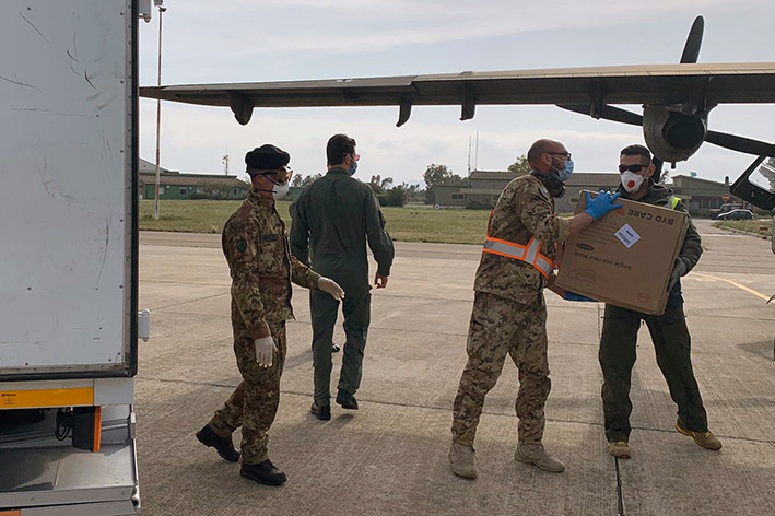 Proseguono intanto le operazioni di scaricamento e trasporto da parte di assetti logistici della Brigata Sassari di materiale sanitario destinato alla Protezione Civile regionale. Altri importanti carichi di mascherine chirurgiche e filtranti facciali (certificati FFP2 e FFP3), ma anche provette per esami microbiologici e tamponi sono atterrati tra ieri e oggi all’aeroporto militare di Decimomannu e di Cagliari-Elmas. Il materiale sanitario proveniente da Milano Malpensa ha viaggiato a bordo di un Dornier dell’Aeronautica Militare e di un C-27J della Leonardo (la principale azienda industriale italiana e tra le più importanti aziende dell’aerospazio, difesa e sicurezza al mondo).