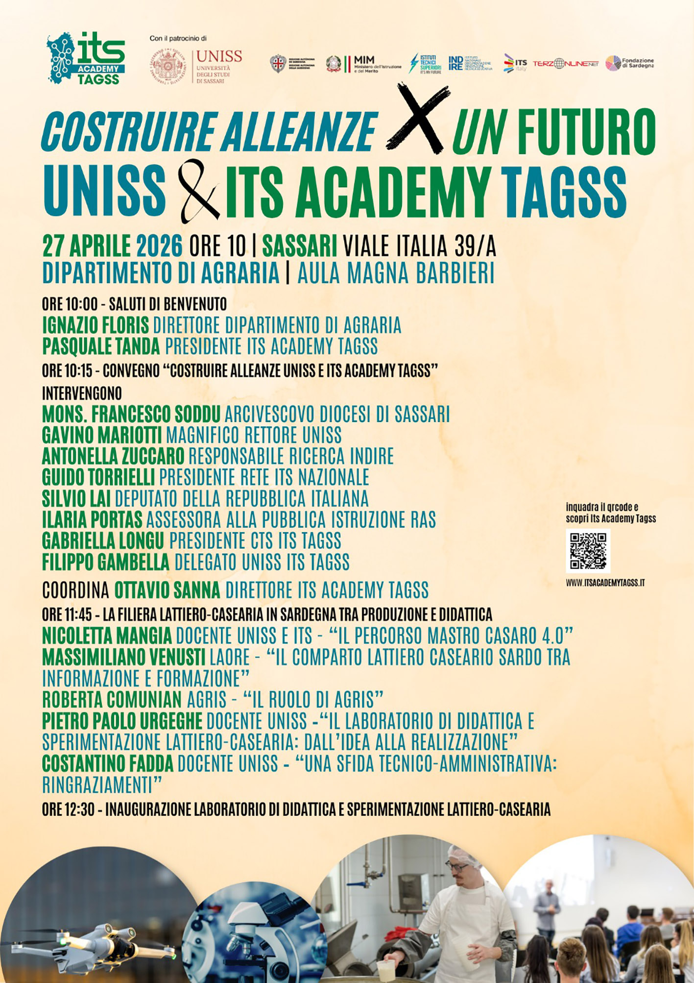 Sassari. Si terrà questa mattina, lunedì 27 aprile, a partire dalle 10, nell’Aula Magna Barbieri del Dipartimento di Agraria dell’Università di Sassari (viale Italia 39/A), il convegno “Costruire alleanze UNISS & ITS Academy TAGSS”, un’importante occasione di incontro tra istituzioni, mondo accademico, sistema della formazione terziaria professionalizzante e realtà produttive del territorio.