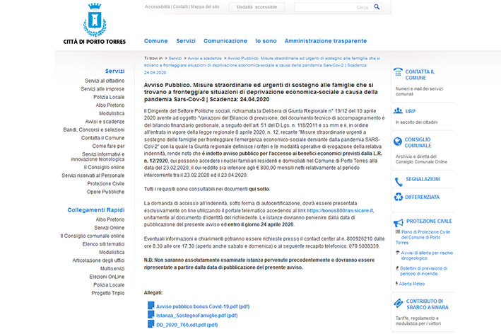 Porto Torres. Sono stati pubblicati nella home page del sito web del Comune di Porto Torres, nella sezione Avvisi e scadenze, la modulistica e l’avviso pubblico avente ad oggetto le indennità per le famiglie che si trovano in “situazioni di deprivazione economica-sociale a causa della pandemia Sars-Cov-2”. Le domande dovranno essere inviate esclusivamente al portale online della Regione Sardegna, Bonus800Ras (https://bonus800ras.sicare.it), unitamente al documento d’identità del richiedente. Non saranno esaminate istanze pervenute precedentemente, le quali dovranno essere ripresentate a partire dalla data di pubblicazione dell’avviso. La documentazione dovrà pervenire entro il 24 aprile 2020.