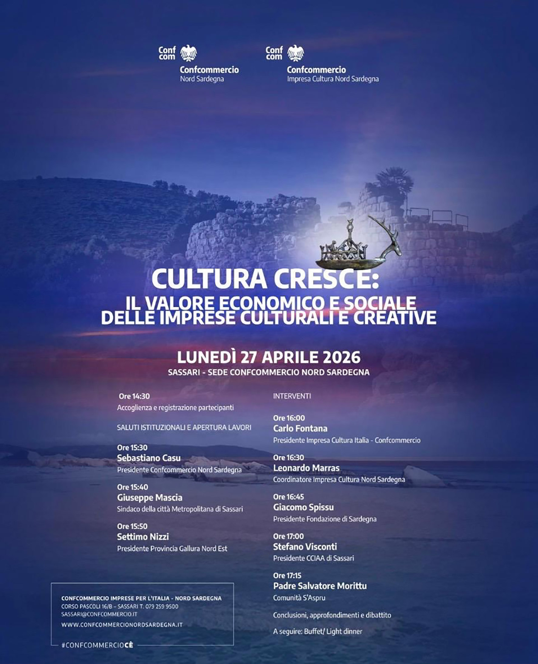 Sassari. La cultura non è solo patrimonio, ma un motore pulsante dell’economia e del benessere sociale del territorio. È questo il tema centrale dell’evento “Cultura Cresce: il valore economico e sociale delle imprese culturali e creative”, organizzato da Confcommercio Nord Sardegna e Impresa Cultura, che si terrà oggi, lunedì 27 aprile, alle 15.30 nella sede dell’Associazione in corso Pascoli 16/B.