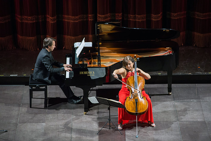 I due musicisti condividono da anni vita privata e artistica e formano un affiatato duo musicale, con un repertorio di oltre 80 Sonate per violoncello e pianoforte e un’importante discografia per l’etichetta Decca. Poche settimane fa al Teatro Rossini di Pesaro hanno festeggiato il felice traguardo di 250 concerti insieme nei cinque continenti: dalla Salle Gaveau di Parigi alla Sala Cecília Meireles di Rio de Janeiro, dall’Accademia di Santa Cecilia di Roma all’Hermitage di San Pietroburgo, dalla Victoria Hall di Ginevra allo Shanghai Arts Centre.