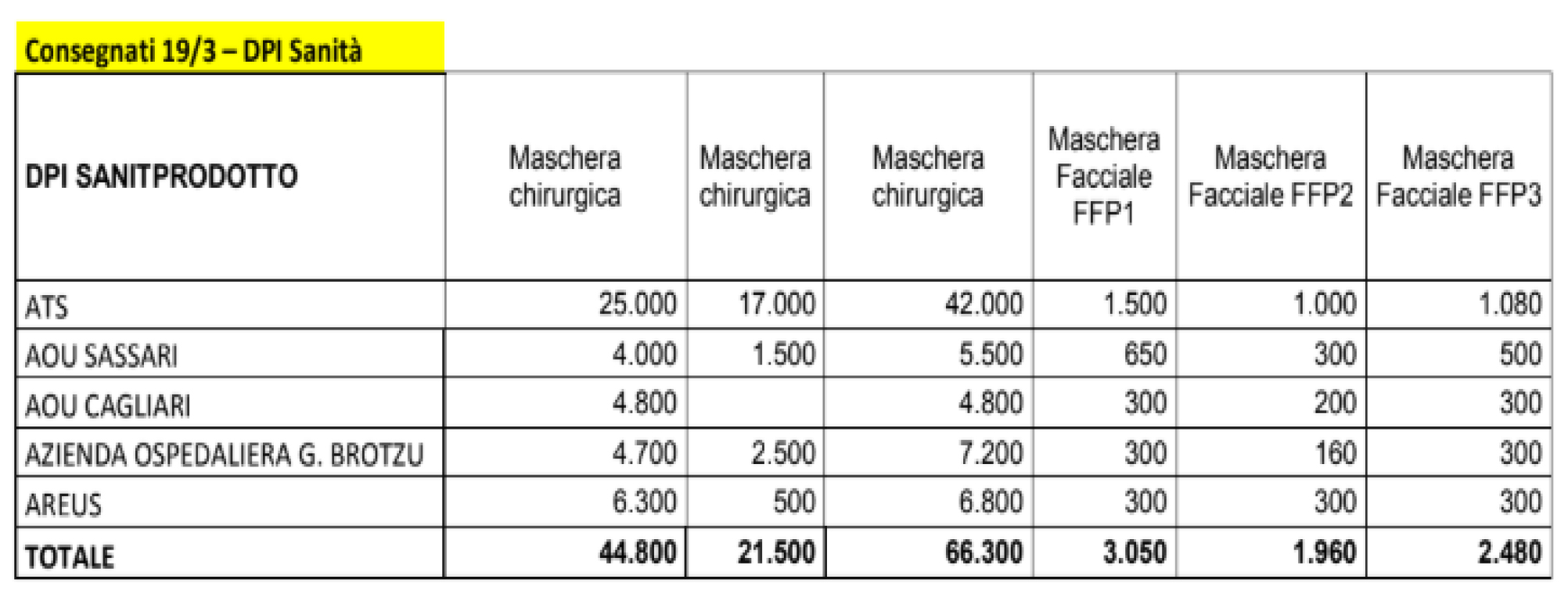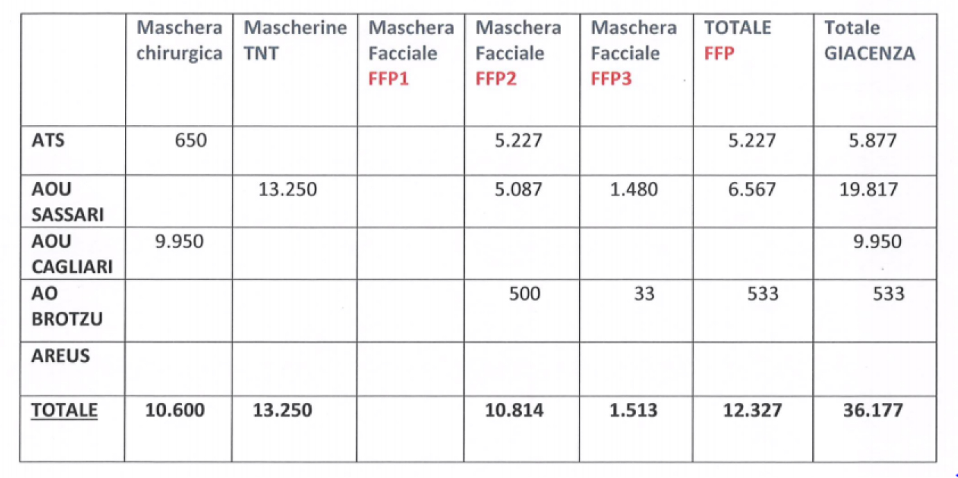 Alla presenza dei responsabili delle diverse aziende sanitarie, degli assessorati coinvolti e del Prefetto di Cagliari, in qualità di coordinatore degli UTG della Regione, è emerso un dato di segno chiaramente inverso, in quanto al 18 marzo è stata certificata la giacenza presso le Aziende di oltre 36.000 mascherine. In particolare, è stato smentito dall’Azienda Ospedaliera Universitaria di Sassari che il personale abbia mai operato in assenza di Dpi e questo è testimoniato anche da una presenza nei depositi della stessa AOU alla data del 18 marzo di ben 19.000 mascherine.