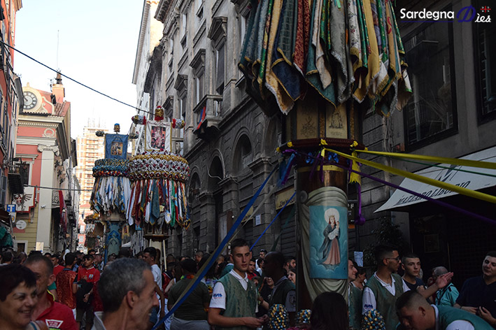 Ieri sera corso Vittorio Emanuele e corso Vico sono stati conquistati da 17 ceri, che riprendono nei nomi e nei colori i grandi Candelieri del 14 agosto