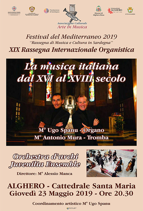 Il primo appuntamento del Festival del Mediterraneo, che apre anche la 19ª Rassegna Internazionale Organistica, è fissato per giovedì 23 maggio alle ore 20,30 ad Alghero, nella cattedrale di Santa Maria, con la serata “La Musica italiana dal XVI al XVIII secolo”. Protagonisti i maestri Ugo Spanu all’organo e Antonio Mura alla tromba, entrambi docenti al Conservatorio di Sassari, che eseguiranno musiche di Frescobaldi, Viviani, Gabrieli, Albinoni, Pasquini e Marcello, insieme allo Juvenilia Ensemble, diretto dal maestro Alessio Manca, che invece proporrà di Antonio Vivaldi il Concerto per flauto, archi e basso continuo op.10 n.3 “Il Cardellino” (flauto solista Nicola Roggio) e il Concerto grosso in la minore (Emanuele Piga e Samuele Cossu violini concertanti).