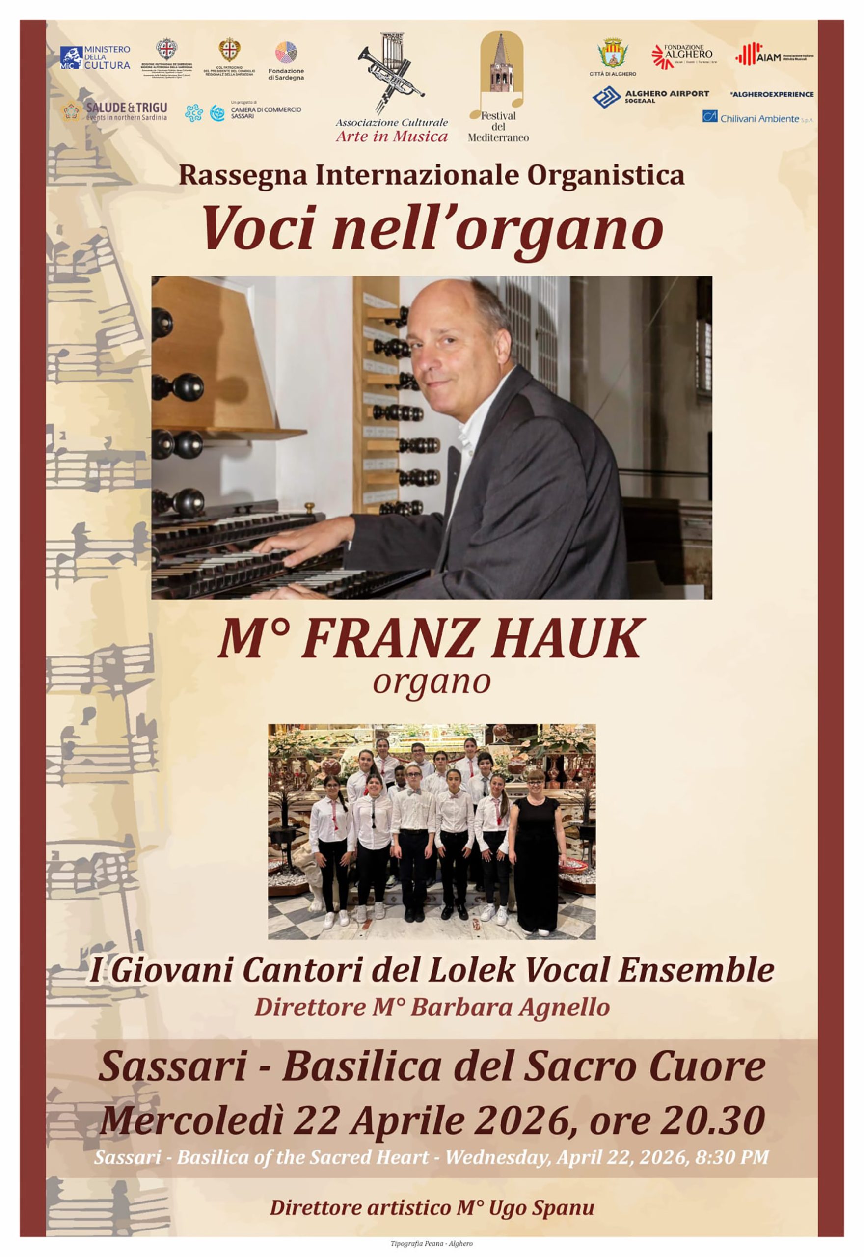 Nuovo appuntamento con la musica per organo e corale oggi, mercoledì 22 aprile alle 20.30, nella basilica del Sacro Cuore a Sassari. Il concerto è proposto nell’ambito della XXVI Rassegna Internazionale Organistica inserita nel più ampio calendario del Festival del Mediterraneo 2026, manifestazione musicale ideata e curata dall’Associazione Arte in Musica, con la direzione artistica del maestro Ugo Spanu. Protagonisti della serata “Voci nell’organo” saranno l’organista tedesco Franz Hauk e i Giovani Cantori del Lolek Vocal Ensemble, diretti da Barbara Agnello. Il Festival del Mediterraneo è sostenuto da Ministero della Cultura, Regione Sardegna, Consiglio Regionale della Sardegna, Fondazione di Sardegna, Camera di Commercio di Sassari attraverso il network “Salude&Trigu”, Fondazione Alghero, Comune di Alghero, Alghero Airport e Chilivani Ambiente.