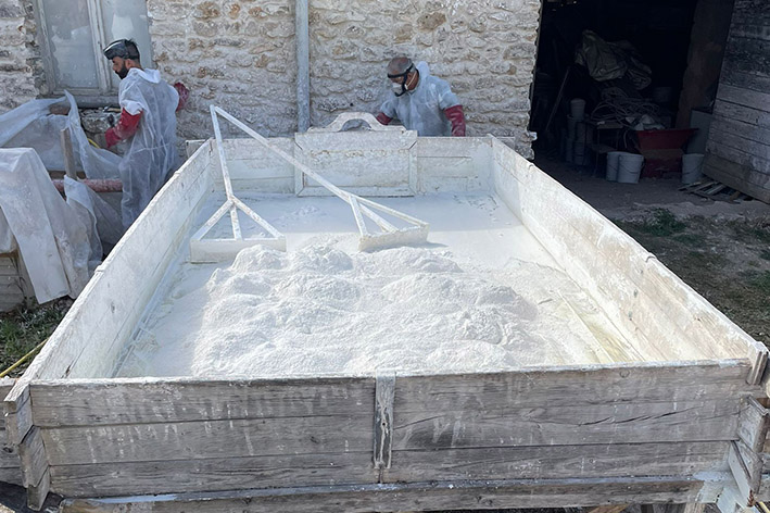 Il maestro Salis ha illustrato le variabili che influenzano il procedimento, come le condizioni atmosferiche e la granulometria della calce viva, mostrando anche strumenti e metodi di lavoro tramandati nei secoli. Particolare interesse ha suscitato la produzione del grassello di calce, materiale destinato a lunghe fasi di maturazione e utilizzato per finiture, intonaci e decorazioni di pregio.