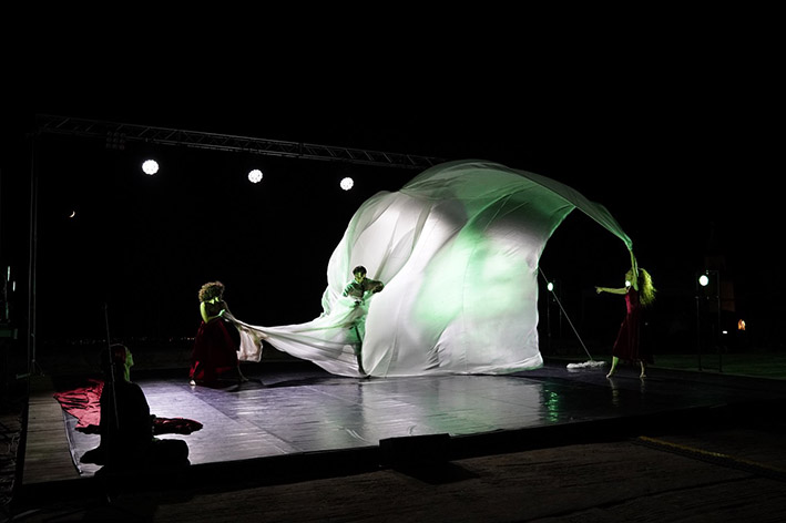 A partire da queste premesse, sono stati tantissimi gli aspetti emozionali che la compagnia Res Extensa ha cercato di rappresentare attraverso il movimento agli spettatori di Sennori: dall’espressione di gioia agli stati d’ansia, dall’ironia alla sensualità fino alla rappresentazione della tempesta con l’utilizzo di un grande lenzuolo di seta.