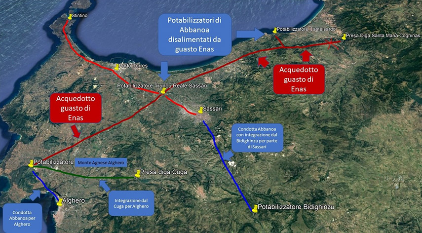 In base al protocollo operativo definito dall’assessorato regionale ai Lavori pubblici sono state attivate, in favore degli impianti Abbanoa di Truncu Reale e Monte Agnese, delle linee di rifornimento alternative che dovrebbero sopperire al 60 per cento del fabbisogno ordinario sfruttando il bacino del Cuga.
