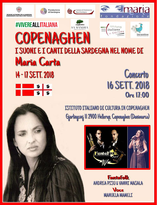 Domenica 16, presso l’Istituto Italiano di Cultura di Copenaghen i suoni e le musiche della Sardegna incontrano la città nel nome di Maria Carta. Dopo i saluti di rito affidati al presidente Marras e ai vertici dell’Istituto, verrà proiettato un breve filmato che ripercorre l’attività artistica di Maria Carta. A seguire il concerto del duo Fantafolk (Andrea Pisu alle launeddas e Vanni Masala all’organetto) e di Manuela Mameli che proporrà una serie di brani della tradizione, alcuni di essi appositamente rivisitati per l’occasione.