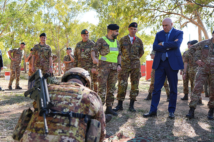 Il ministro, accompagnato dal capo di Stato Maggiore della Difesa, generale Luciano Portolano, e dal capo di Stato Maggiore dell’Esercito, generale di corpo d’armata Carmine Masiello, è stato accolto nella Caserma Gonzaga dal comandante dei Dimonios, generale di Brigata Andrea Fraticelli. Dopo aver reso omaggio alla Bandiera di Guerra del 152° reggimento fanteria “Sassari” e del 45° Reparto Comando e Supporti Tattici “Reggio”, Crosetto si è recato nelle stazioni addestrative della Caserma Gonzaga per assistere a una serie di attività di addestramento e sperimentazione sviluppate secondo il concetto di Home Station Training. Tali attività mirano a mantenere elevata la prontezza operativa delle unità della “Sassari”, nell’ottica di un sempre maggiore sviluppo di capacità integrate di addestramento che sfruttino sia le potenzialità della simulazione digitale, sia i benefici dell’addestramento sul terreno. Il ministro ha potuto constatare personalmente l’efficacia del percorso addestrativo adottato, che consente un trasferimento immediato delle competenze sviluppate in ambiente simulato al contesto reale, con l’obiettivo di testare procedure operative, interoperabilità tra sistemi e capacità decisionale.