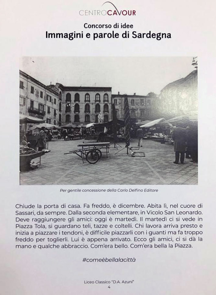Sassari. La piazza Tola disegnata nel racconto di Enrico Corrias della 4ª C del liceo classico Azuni, hashtag: #comeèbellalacittà. La piazza Azuni descritta fra le righe del testo di Carola Panu della 5ª D del liceo classico Azuni, hashtag: #eternità. La stazione ferroviaria immortalata dalle parole di Francesca Bin della 5ª L del liceo musicale Azuni, hashtag: #iltrenodeiricordi. Questi gli studenti – classificatisi rispettivamente al primo, secondo e terzo posto fra i 15 partecipanti selezionati – che con il loro meticoloso impegno, la loro fantasia e il loro estro nello scrivere testi densi di poesia, interesse e significato, si sono aggiudicati la prima edizione del contest “Immagini e Parole di Sardegna” organizzato dall’Associazione ccn Centro Cavour – elaborazione grafica di Enrico Pinna – in collaborazione con la dirigenza e i docenti dell’Azuni di Sassari, nello specifico Gian Piero Farena (responsabile della comunicazione dell’istituto), Salvatore Altana (professore del liceo musicale) e la professoressa Antonella Buzzerio (liceo coreutico), che si sono rapportati a Erika Gallizzi, socia dell’Associazione. Alcuni dei ragazzi coinvolti sono parte integrante della redazione di “Azuni News”.