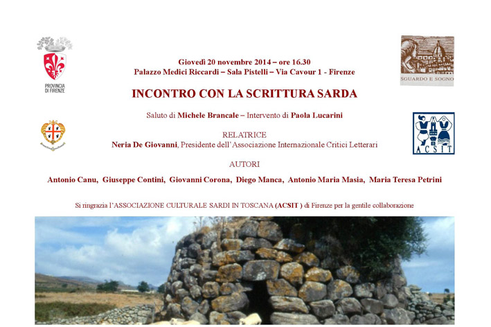 SardiFirenze2Firenze. Paola Lucarini e Neria De Giovanni hanno organizzato “Incontro a Firenze con la scrittura sarda”, uno di quegli incontri che forse non passeranno alla storia, forse, ma che resterà nel cuore delle persone che hanno avuto il privilegio di ascoltare le parole e i versi che alcuni poeti e scrittori sardi ci hanno regalato. La Provincia di Firenze ci ha permesso di svolgere questo incontro nella meravigliosa Sala Pistelli, una perla incastonata in uno dei Palazzi più belli di Firenze, Palazzo Medici.