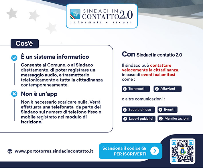 Il Comune di Porto Torres rafforza sempre più il contatto diretto con i propri cittadini e dà il via al nuovo servizio gratuito “Sindaci in contatto 2.0”, l’innovativo sistema informatico che, in caso di informazioni di emergenza o di pubblica utilità, consente all’amministrazione comunale di trasmettere contemporaneamente a tutta la cittadinanza un messaggio vocale da parte dell’amministrazione, registrato o letto da un sistema di sintesi vocale, raggiungendo telefonicamente anche quella parte di popolazione che, per restare aggiornata, non utilizza i social network o il sito istituzionale. Gli utenti non dovranno scaricare nessuna app ma riceveranno direttamente una telefonata sul proprio telefono fisso o mobile qualora abbiano aderito al servizio.