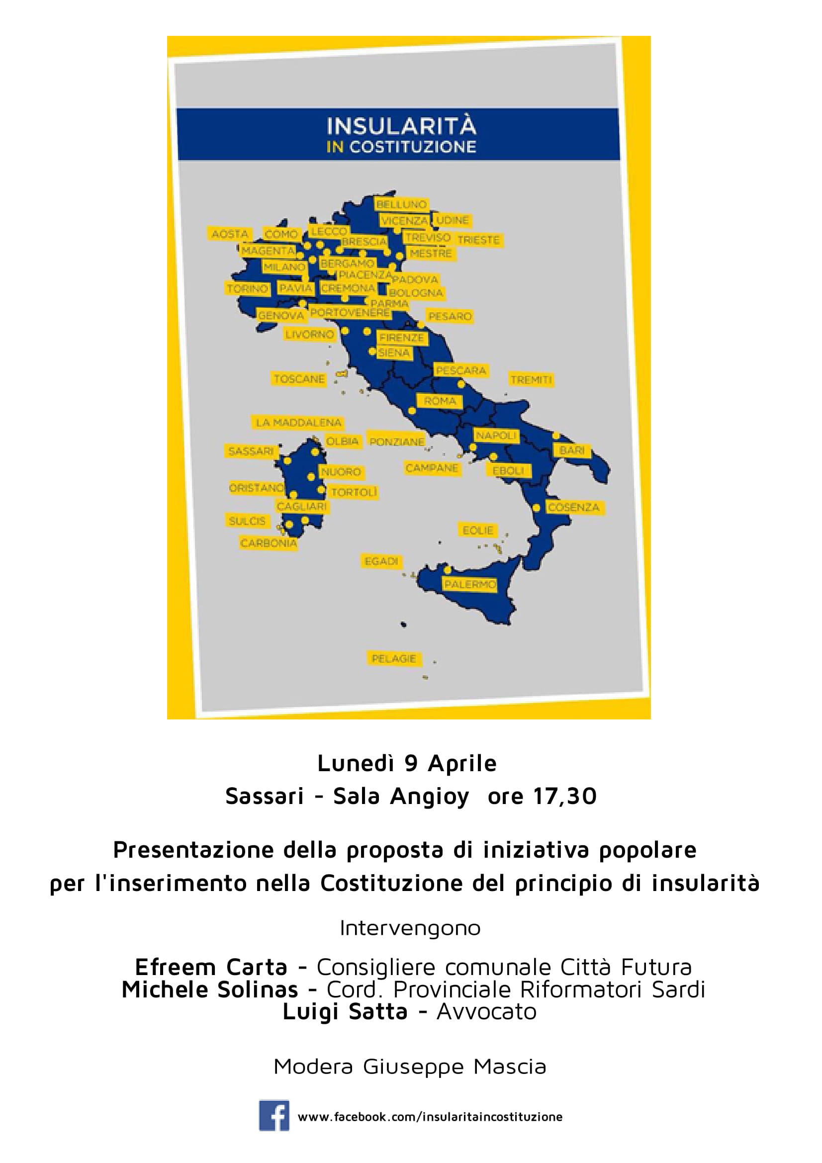 All’incontro convocato per le 17.30 interverranno Efreem Carta, consigliere comunale del gruppo “Città Futura” a Sassari, Michele Solinas coordinatore provinciale dei Riformatori sardi e l’avvocato Luigi Satta. Modera il consigliere comunale del PD a Sassari, Giuseppe Mascia.