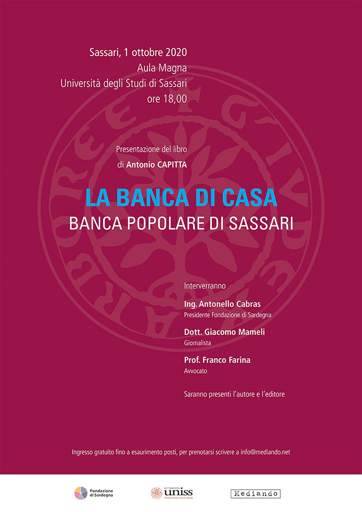 Sassari. Giovedì 1 ottobre, alle ore 18, presso l’Aula Magna dell’Università degli studi di Sassari, avrà luogo la presentazione del libro “La banca di casa. Banca Popolare di Sassari”, Mediando Edizioni. Interverranno Antonello Cabras, presidente della Fondazione di Sardegna, il giornalista Giacomo Mameli e il professor Franco Farina. Saranno presenti l’autore e l’editore.