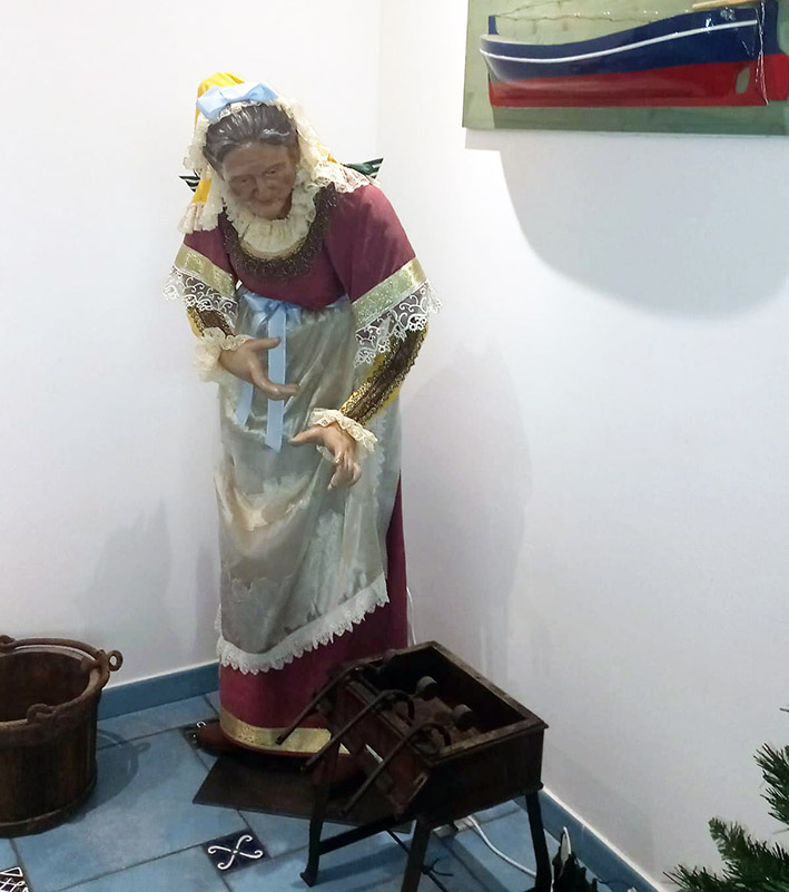 Quest’anno si è aggiunta una nuova statua, quella della popolana Carmela, una delle figure fondamentali del presepe napoletano, arrivata dalla Campania. Una statua che “indossa” un vero vestito in tessuto e che, per non essere rovinata dalle intemperie, è stata posizionata all’interno di un’attività commerciale sul lungomare Cristoforo Colombo.