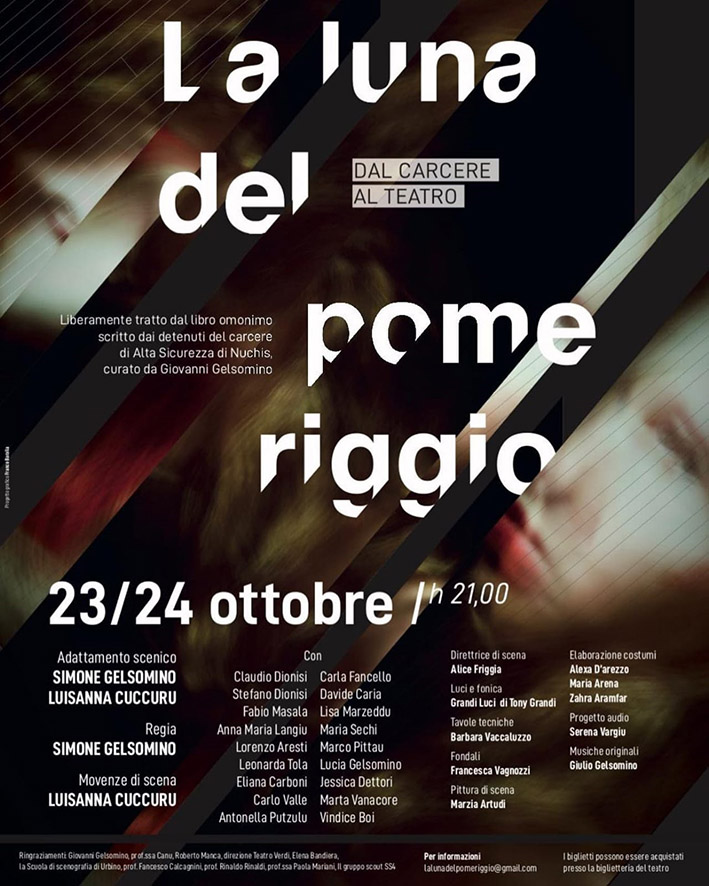Con lo spettacolo “Luna del pomeriggio” si vuole raccontare cosa c’è dietro questo pensiero. Quali sono i volti e le aspirazioni delle persone che in questo momento sono in carcere. La regia è opera dell’esordiente Simone Gelsomino, laureando in scenografia all’Accademia delle Belle Arti di Urbino e che, con il contributo di Luisanna Cuccuru, ha curato anche l’adattamento dei testi. Con Claudio Dionisi, Stefano Dionisi, Fabio Masala, Anna Maria Langiu, Lorenzo Aresti, Leonarda Tola, Eliana Carboni, Carlo Valle, Antonella Putzolu, Carla Fancello, Davide Caria, Lisa Marzeddu, Maria Sechi, Marco Pittau, Lucia Gelsomino, Jessica Dettori, Marta Vanacore, Vindice Boi.
