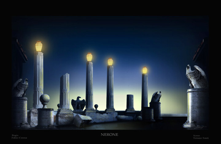 Nerone viene rappresentata in un nuovo allestimento del Teatro Lirico di Cagliari firmato per la regia da Fabio Ceresa (Rivolta d’Adda, 1981), apprezzato librettista e artista al suo debutto a Cagliari, che, fra l’altro, ha curato, nel 2015, il libretto per La Ciociara di Marco Tutino, eseguita al Teatro Lirico di Cagliari nel 2017; per le scene da Tiziano Santi, per i costumi da Claudia Pernigotti, per le luci da Daniele Naldi e per la coreografia da Mattia Agatiello. Una lettura didascalica e il pieno rispetto del libretto sono alla base di questa proposta visiva dell’opera che presenta scene lineari, pulite, per lasciare ampio spazio alla recitazione degli artisti che vestono costumi colorati e di pregevole fattura. Il regista ha pensato a un ponte ideale tra l’impero romano del I secolo d. C. (l’epoca, appunto, di Nerone) e l’impero coloniale italiano degli anni intorno alla prima dell’opera. Le riconoscibili architetture dell’Eur e della cupola della Basilica dei Santi Giovanni e Paolo (unica basilica romana ad essere terminata nel Novecento), si fondono con colonne, cippi, rovine, aquile e làbari romani in un’atmosfera omogenea e di sicuro fascino. Di enorme rilievo il sipario e l’ultimo quadro dell’opera, dove spicca il ritratto di Nerone, fedele riproduzione dell’originale marmoreo che si può ammirare al Museo Archeologico Nazionale di Cagliari.