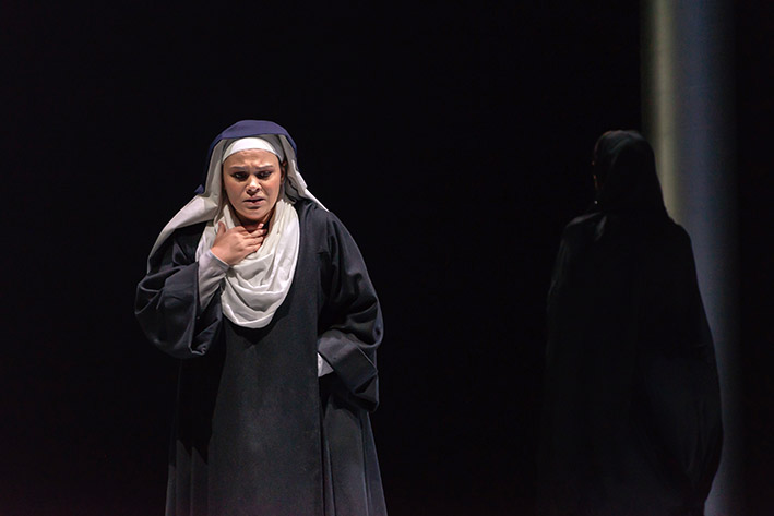 “Suor Angelica” quindi, vicenda dalle tinte cupe, che si svolge nel XVII secolo nei pressi di Siena, in un convento che accoglie una religiosa dal passato da nascondere. La zia principessa, nobildonna austera e glaciale, chiede alla nipote, chiusa in convento per evitare lo scandalo alla famiglia, di rinunciare alla propria dote a favore della sorella prossima al matrimonio, e comunicando nell’occasione la morte del figlioletto di Angelica. Una rivelazione sconvolgente per la protagonista, che medita e realizza così l’atto estremo, unica strada per ricongiungersi al proprio bambino. Un’altra vicenda lugubre, terribile, nella quale il senso della solitudine domina l’opera. La regia di Giulio Ciabatti, con il progetto scenico di Maddalena Moretti e le luci di Tony Grandi, propone così una ricostruzione che evita uno scontato ambiente manzoniano e nella quale il convento è solo accennato nelle colonne dello sfondo. La musica di Giacomo Puccini, su libretto di Giovacchino Forzano, accentua i toni drammatici, senza concedere nessun passaggio leggero. Un senso di angoscia e di attesa della tragedia si avverte nella partitura sin dall’inizio. Fino al bagliore finale e alla salvezza garantita dalla Madonna a Suor Angelica, che ottiene perdono per il suo gesto. A completare l’allestimento i costumi tradizionali di Filippo Guggia.