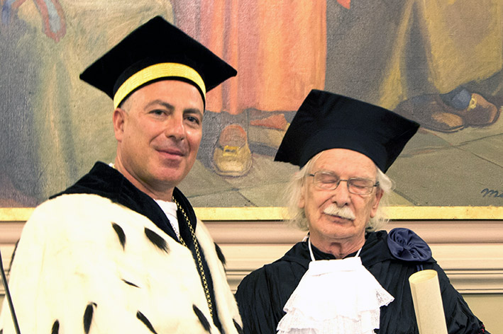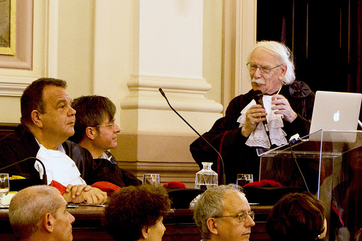Alla fine della lectio doctoralis, un lungo applauso ha sottolineato il conferimento della pergamena a Rizzolatti da parte del Magnifico Rettore dell’Università di Sassari, Massimo Carpinelli, che ha consegnato al neurologo anche il sigillo storico dell’Ateneo di Sassari. La cerimonia, introdotta dal Coro dell’Università di Sasasri con il Gaudeamus Igitur, si è aperta proprio con i saluti del Rettore e del Direttore del Dipartimento di Scienze umanistiche e sociali, Gavino Mariotti. Baingio Pinna, professore di Psicologia generale, ha poi illustrato le motivazioni della proposta di conferimento della laurea ad honorem, prima di lasciare la parola al protagonista della giornata. Hanno presenziato i componenti del Senato accademico e numerosi rappresentanti del Dipartimento.