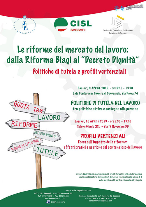 Sassari. “Le riforme del mercato del lavoro, dalla riforma Biagi al decreto dignità” è il titolo del convegno organizzato e promosso dalla Cisl territoriale di Sassari in programma il 9 e 10 aprile prossimi nella sala conferenze della Camera di commercio e nel salone Giordo della sede Cisl di via IV Novembre.
