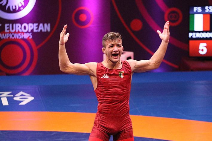 Faenza. Simone Piroddu è medaglia d’oro ai Campionati europei cadetti che si sono svolti a Faenza al Pala Cattani. Il pubblico presente e i tifosi da casa collegati sul sito della UWW per la diretta streaming hanno assistito a una finale al cardiopalma, ma sempre tenuta sotto controllo da un’impeccabile prestazione di Simone Piroddu che si è imposto sul turco Muhammet Karavus con il punteggio di 5 a 0, conquistando così la medaglia d’oro e il titolo di Campione europeo cadetti stile libero nella categoria 55Kg.