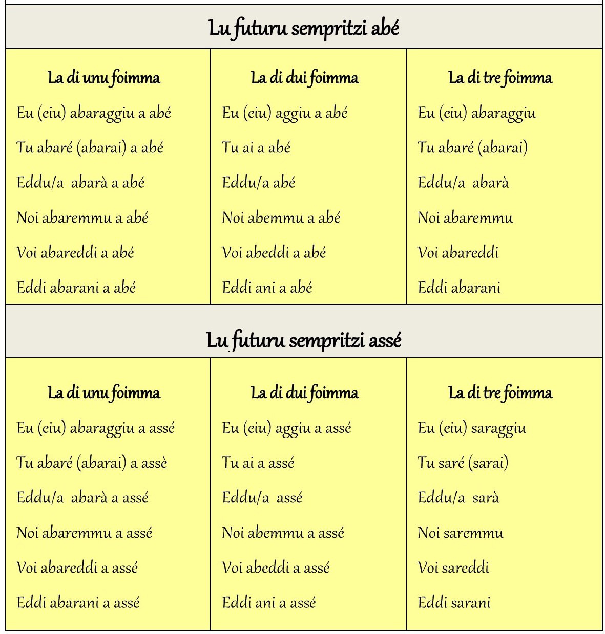 - Abaraggiu a assé = sarò. Abaraggiu a assé isthaddu = sarò stato.