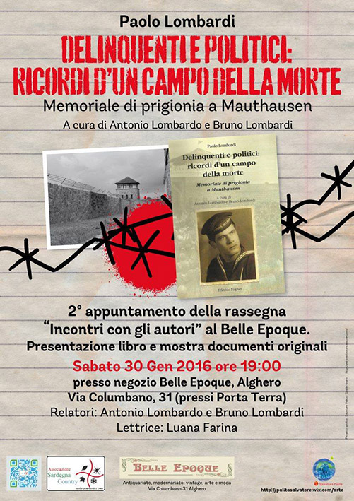 Alghero. Per commemorare la Giornata della Memoria di quest’anno, il negozio di antiquariato Belle Epoque ad Alghero, propone la presentazione del libro “Delinquenti e politici: ricordi d’un campo della morte – Memoriale di prigionia a Mauthausen” di Paolo Lombardi a cura di Antonio Lombardo e Bruno Lombardi edito dalla casa editrice Fagher. La presentazione è il secondo appuntamento della rassegna “Incontri con gli autori” promossa dal negozio di antiquariato Belle Epoque.