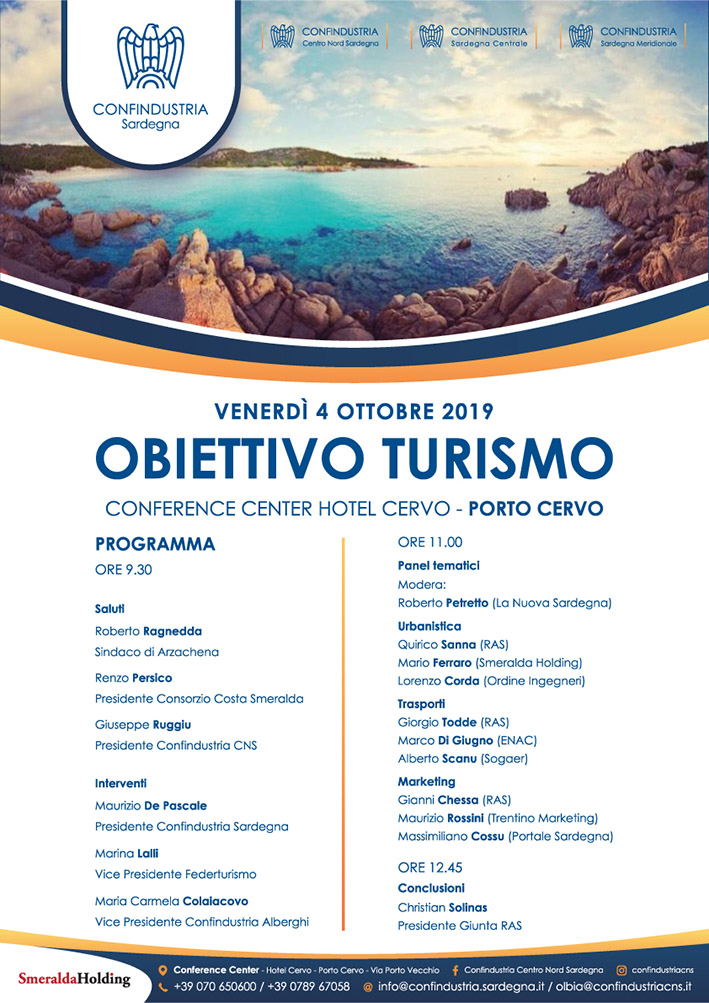 Il programma. Il convegno si aprirà alle 9,30 con i saluti del sindaco di Arzachena Roberto Ragnedda, del presidente del Consorzio Costa Smeralda Renzo Persico e del presidente di Confindustria CNS Giuseppe Ruggiu. Subito dopo interverranno Maurizio De Pascale, presidente di Confindustria Sardegna, di Marina Lolli, vicepresidente di Federturismo, e di Maria Carmela Colaiacovo, presidente di Confindustria Alberghi. Dalle 11 spazio ai panel tematici, con gli interventi che saranno moderati dal giornalista della Nuova Sardegna Roberto Petretto. Per il tema Urbanistica saranno presenti l’assessore regionale Quirico Sanna, Mario Ferraro (Smeralda Holding) e Lorenzo Corda (Ordine degli Ingegneri); per il tema Trasporti si confronteranno l’assessore regionale Giorgio Todde, Marco Di Giugno (Enac) e Alberto Scanu (Sogaer); per il Marketing parteciperanno al dibattito l’assessore regionale del Turismo Gianni Chessa, Maurizio Rossini (Trentino Marketing) e Massimiliano Cossu (Portale Sardegna).