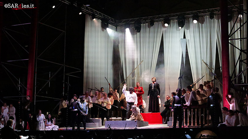 Venerdì sera è però mancato soprattutto il cast e anche la regia ha mostrato più di un limite. Iniziamo dalle voci. Fuori parte il protagonista, il tenore messicano Hector Lopez Mendoza, al posto del previsto Dario di Vietri. A complicare una prestazione vocale non convincente anche una presenza recitativa poco apprezzabile (un Otello impacciato sul palcoscenico ci mancava). Il timbro inoltre è sembrata un’imitazione malriuscita di Kaufman. Una resa generale da parte di Lopez Mendoza un po’ inspiegabile, anche perché sul web la sua voce si può sentire più cristallina e per niente brunita come apparsa invece a Sassari, tanto che qualcuno ha azzardato un rimando al registro di baritenore. Tutto l’opposto Marco Caria, basso baritono che ormai è una garanzia per l’Ente Concerti sin da La Traviata del 2022 (un ottimo Germont padre) e poi lo scorso anno Tonio in Pagliacci e in Nabucco. Qualche dubbio anche per il soprano Angela Nisi, lo scorso anno sempre in piazza d’Italia Nedda in Pagliacci: la Canzone del salice e l’Ave Maria del quarto atto, i pezzi di Otello che vengono eseguiti nei recital, mancavano di sentimento seppure accettabili nel complesso. Sufficiente il resto del cast: Roderigo era Nicolas Resinelli, Montano Michael Zeni, un araldo Stefano Arnaudo, Emilia Francesca Pusceddu e Ludovico era il bravo basso Tiziano Rosati (l’ottimo Basilio del Barbiere del 2023 al Teatro Comunale).