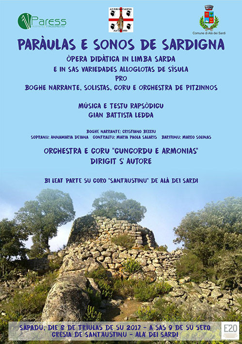 Alà dei Sardi. Sabato 8 luglio alle 21, nella chiesa parrocchiale Sant’Austinu di Alà dei Sardi, andrà in scena, in forma di oratorio, la “prima” di “Paraulas e Sonos de Sardigna”, prima opera didattica in lingua sarda e nelle varietà alloglotte per soli, coro, orchestra giovanile e voce narrante di Gian Battista Ledda, docente di teoria e semiografia del Conservatorio “Luigi Canepa” di Sassari. Sarà una festa di giovani, per i giovani e gli ex giovani. Coru e Orchestra de pitzinnos “Cuncordu e armonias”: 31 strumentisti preparati dai maestri Guglielmo De Stasio (archi), Gianluigi Pani e Giovanna Virdis (fiati e percussioni), e Loredana Serra (arpe); venticinque voci femminili istruite dal professor Vincenzo Cossu, al pari dei tre solisti Annamaria Deiana (soprano), Maria Paola Salaris (contralto) e Marco Solinas (baritono), e una voce narrante in lingua sarda dall’eloquio affascinante, Cristiano Becciu. Dirigerà l’autore.