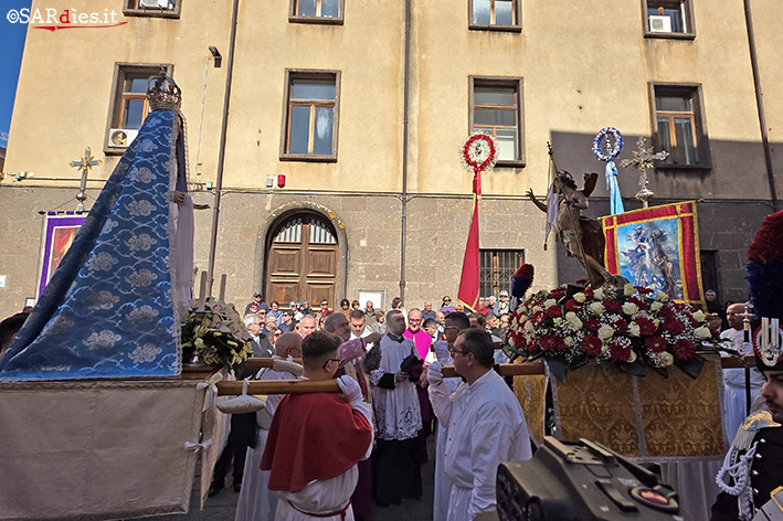 Sassari. Con S’Incontru si sono concluse questa mattina le celebrazioni della Settimana Santa e di Pasqua. Anche a Sassari è stato rinnovato il rito: alle 10,30 in piazza Santa Caterina si sono ritrovati Gesù Risorto e la Beata Vergine Maria non più in lutto. Pochi minuti prima erano convenute le due processioni partite alle 10,15 dalle chiese della Trinità, dove ha sede l’Arciconfraternita di Santa Croce e del Gonfalone (con Gesù Risorto), e di Sant’Antonio Abate, con l’Arciconfraternita dei Servi di Maria (con la Vergine Maria). Presenti in piazza le confraternite riunite e alcuni gremi, insieme all’amministratore diocesano monsignor Antonio Tamponi, al parroco di San Nicola, don Eugenio Cavallo, e al Capitolo turritano. L’Amministrazione comunale era rappresentata dal sindaco Giuseppe Mascia, dal presidente dell’Assemblea Civica Mario Pingerna e da una rappresentanza di assessori e consiglieri. L’accompagnamento musicale è stato curato dalla Banda “Giuseppe Verdi”. Subito dopo il corteo si è diretto al duomo per il solenne pontificale presieduto da monsignor Tamponi.