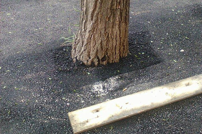 Aggiornamento. Ed ecco l’albero liberato dall’asfalto. La foto è stata postata sul suo profilo Facebook da Tino Grindi, che ha così commentato: «Intervento immediato, ma non so di chi. Le condivisioni su FB hanno provocato una reazione incredibile, tanto da far vergognare chi ha fatto questo atto di morte per gli alberi, impastandoli col catrame».