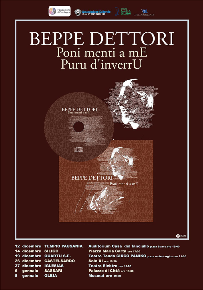 “Poni menti a me”, il progetto discografico in lingua sassarese immaginato da Beppe Dettori con l’Associazione culturale musicale “Sa Perbeke”, attiva sin dal 2005, riparte per un nuovo viaggio di sette date in giro per l’intera Sardegna nella nuova versione combo e acustica “Poni menti a mE puru d’inverrU”. La prima tappa sarà venerdì 12 dicembre alle 19 a Tempio, all’Auditorium “Casa del fanciullo” in piazza Spano (info e prevendite sul circuito Box Office Sardegna, tel. 070680229). Accadrà grazie al sostegno della Fondazione di Sardegna, delle associazioni (fra cui l’Istituto Camillo Bellieni), dei partner (fra cui Grimaldi Sardegna) e dei Comuni che supportano il progetto.