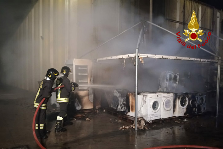 Sassari. Questa notte, intorno alle 4 la Sala operativa del Comando dei Vigili del Fuoco ha ricevuto una richiesta di intervento per un incendio a Predda Niedda, al Mercato delle Pulci di fronte ad Auchan. Sono state inviate sul posto tre squadre, che all’arrivo hanno provveduto alla messa in sicurezza della zona interessata dall’evento e allo spegnimento del rogo. Bruciate varie merci, tra cui lavatrici, ombrelloni, sdraio e gazebo, esposte all’esterno dello stabile. L’intervento dei Vigili del Fuoco ha evitato che le fiamme si potessero propagare all’interno dell’edificio. Erano presenti il 118 e una pattuglia di Polizia. Si cerca di capire le cause che hanno causato l’incendio. L’area è dotata di impianto di videosorveglianza.