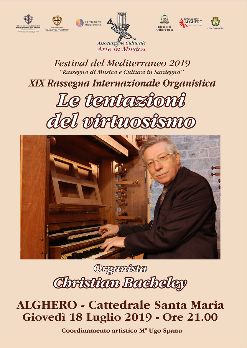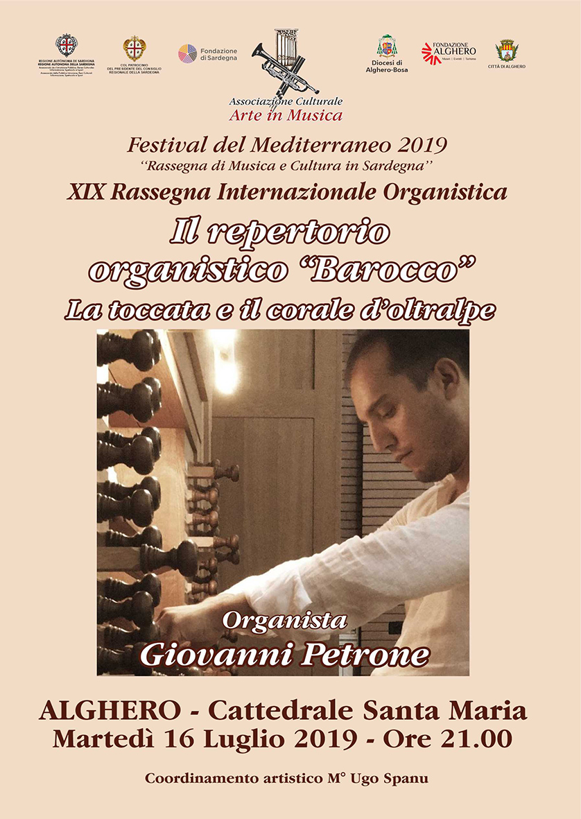 Alghero. Ritorna dopo una breve pausa la XIX Rassegna Internazionale Organistica. Il 16 luglio alle 21 nella cattedrale di Alghero Giovanni Petrone proporrà un concerto dedicato al repertorio organistico barocco, “La toccata e il corale d’oltralpe”; il successivo 18 luglio, sempre nella cattedrale di Alghero alle 21, Christian Bacheley presenterà “Le tentazioni del virtuosismo”. La XIX Rassegna Internazionale Organistica è inserita nel cartellone del Festival del Mediterraneo 2019, organizzato e promosso dall’Associazione Culturale Arte in Musica, con la direzione artistica del maestro Antonio Mura. Tutti gli eventi della kermesse godono del contributo e del patrocinio della Regione Sardegna (Assessorato alla Cultura e Presidenza del Consiglio), delle Fondazioni “di Sardegna” e “Alghero” affiancate dal Comune di Alghero e dalle diocesi di Sassari e Alghero-Bosa.